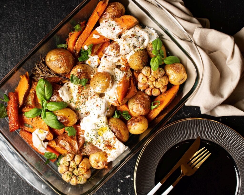 rozmariną. I kepimo indą sudėkite bulves ir morkas, apipilkite jas lydytu sviestu ir alyvuogių aliejumi,