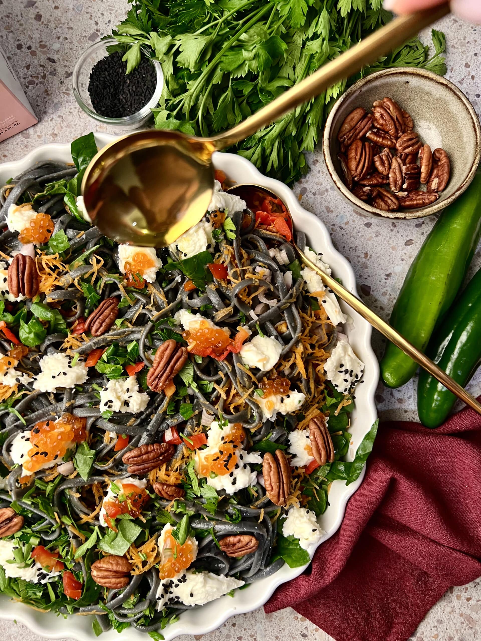 Išvirusius makaronus perkošiame ir perliejame šaltu vandeniu ir pašlakstome alyvuogių aliejumi, kad makaronai nesuliptų. Visas daržoves susmulkiname ir sumaišome su lingviniais. Ant viršaus suplėšome mocarelą, ant jos dedame raudonuosius ikrus, beriame sezamų sėklas ir karijų riešutus.