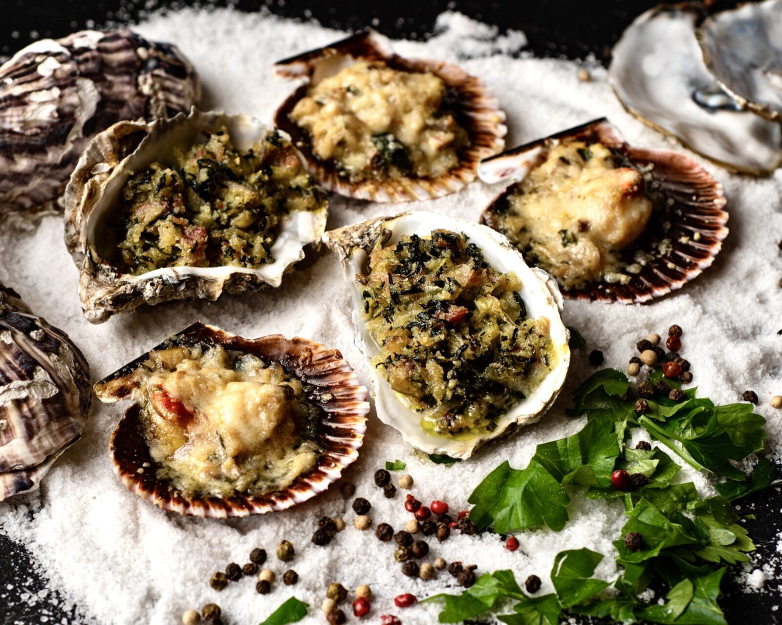 Svogūnus ir česnaką smulkiai supjaustome, grybus sukapojame smulkiais gabalėliais. Moliuskų mėsą nuimame nuo geldelių, 2-3 minutes pakepame svieste ir atidedame į šalį. Svogūną ir česnaką pakepame svieste kol taps skaidrūs, įmaišome grybus. Kelias minutes patroškiname. Supilame vyną, sudedame grietinę ir leidžiame užvirti. Sudedame moliuskus, petražoles, įdedame druskos pagal skonį. Sudedame džiūvėsėlius, jie truputėlį sutrauks drėgmę ir padažas taps tirštesnis. Gautą masę sudedame į moliuskų kiautus ir užbarstome sūriu. Ant skardos paskleidžiame druską ir ją įkaitiname orkaitėje iki 200C. Ant įkaitusios druskos sudedame paruoštus moliuskus ir kepame orkaitėje 8 minutes.