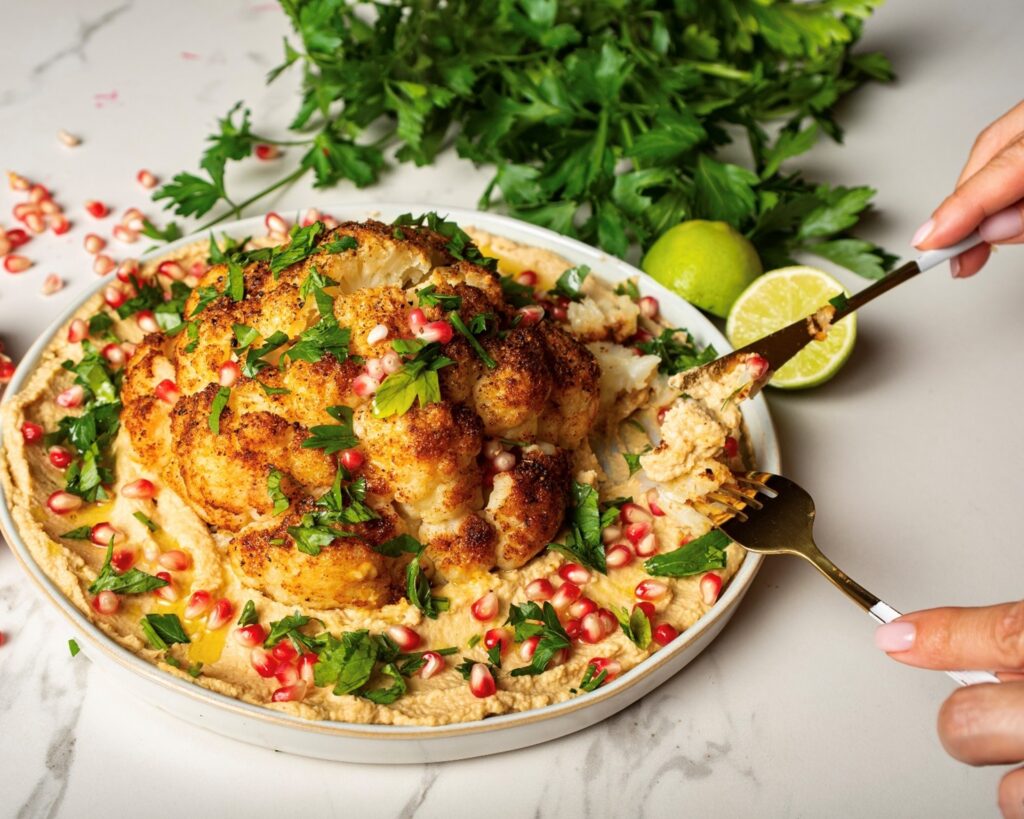 Į lėkštę paskleidžiame humusą, jos viduryje uždedame apskrudusį žiedinį kopūstą. Barstome granato sėklomis, kapotomis petražolėmis, viską pašlakstome alyvuogių aliejumi ir žaliosios citrinos sultimis.