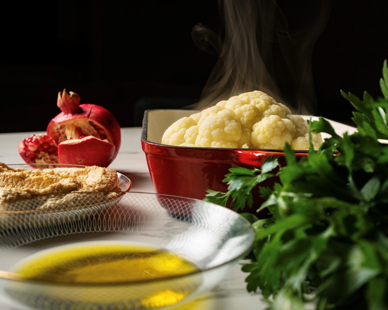 Į lėkštę paskleidžiame humusą, jos viduryje uždedame apskrudusį žiedinį kopūstą. Barstome granato sėklomis, kapotomis petražolėmis, viską pašlakstome alyvuogių aliejumi ir žaliosios citrinos sultimis.