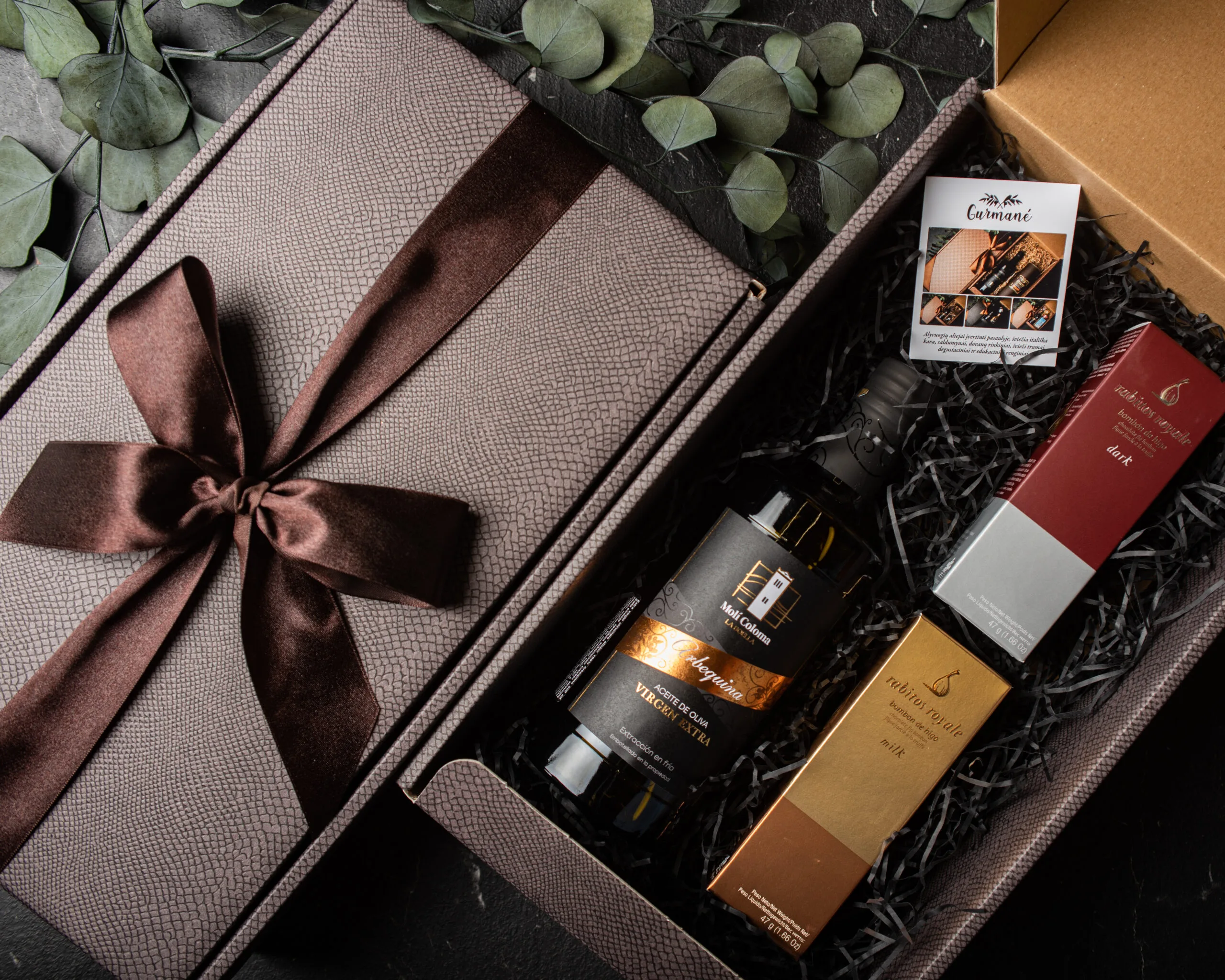 Itališka dovanų dėžutė, atlasinis kaspinas ir popieriaus drožlių užpildas.