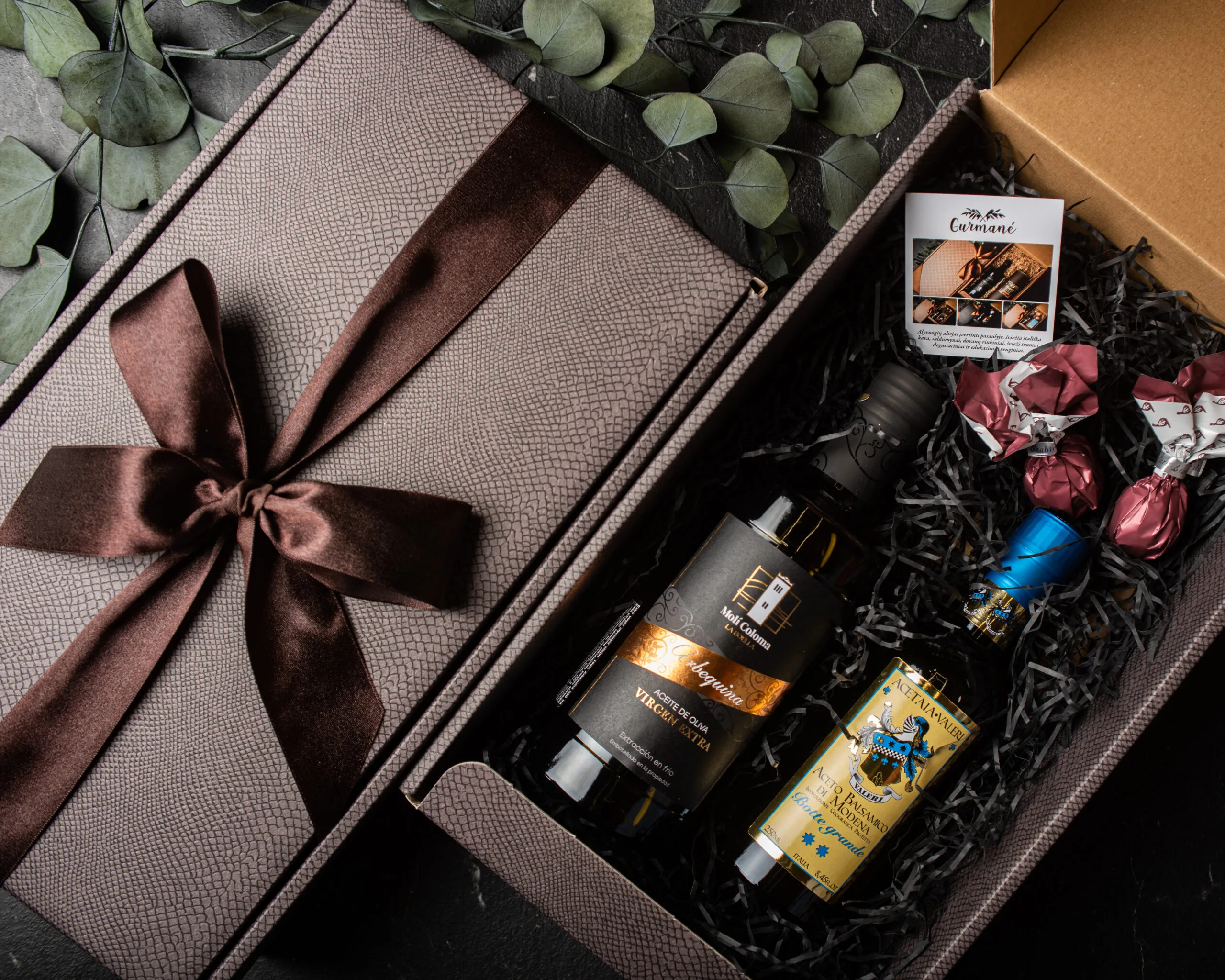 Itališka dovanų dėžutė, atlasinis kaspinas ir popieriaus drožlių užpildas.
