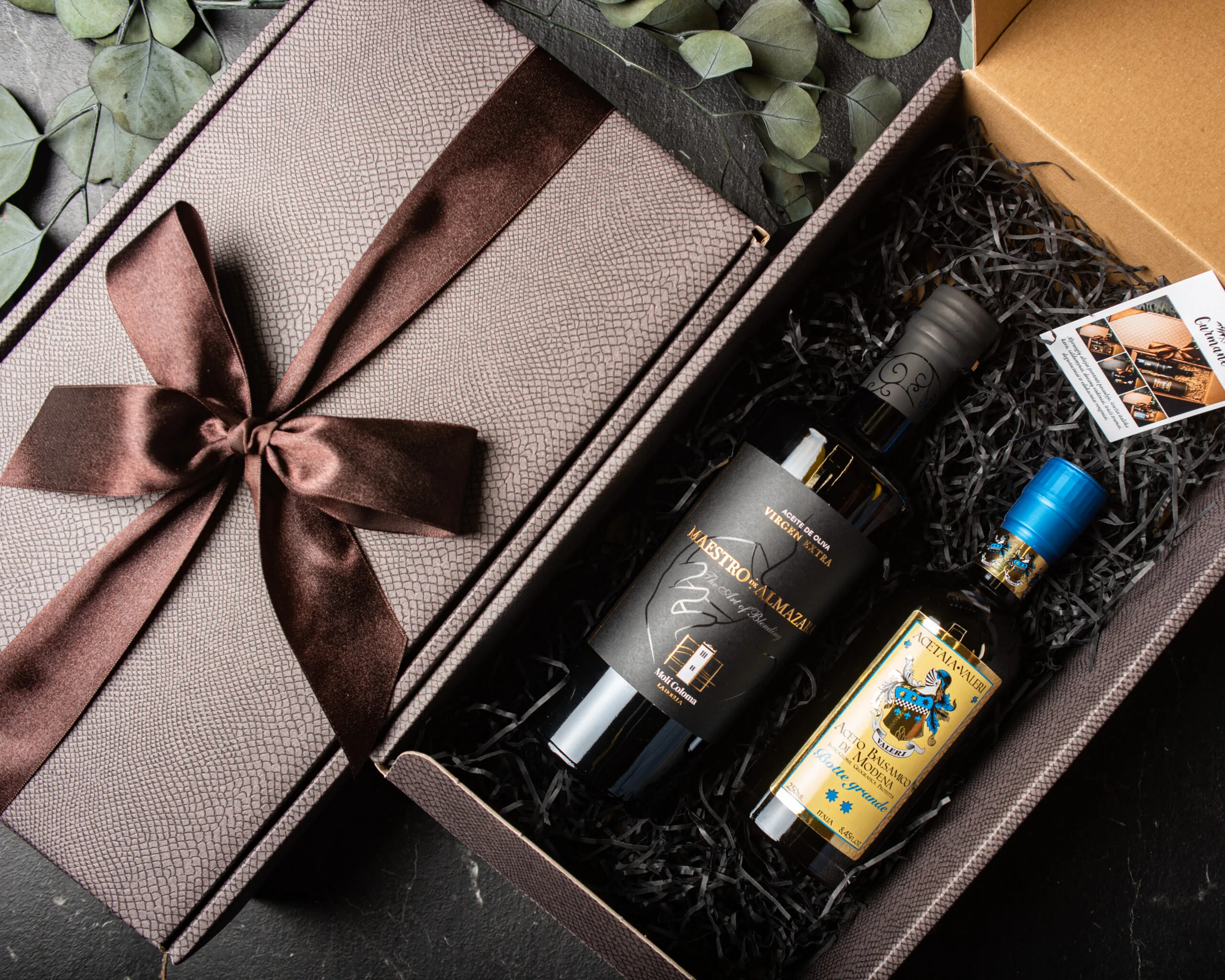 Itališka dovanų dėžutė, atlasinis kaspinas ir popieriaus drožlių užpildas.