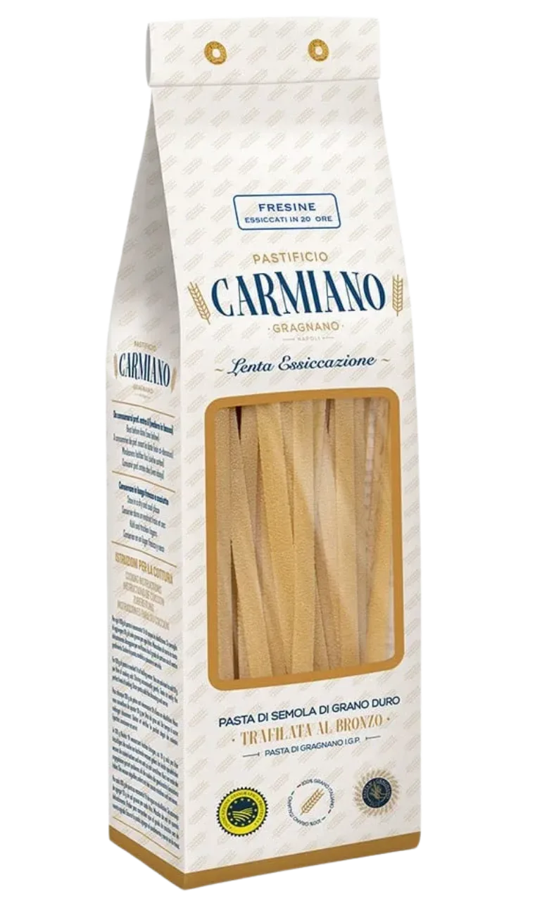 Sudedamosios dalys: kietagrūdžių kviečių miltai, vanduo. 100 g. Maistingumas: energetinė vertė 1551Kj/358Kcal. Riebalai 1,30g iš kurių 0,25g sočiųjų riebalų, angliavandeniai 71g.,iš kurių cukrų 3,4g. baltymai 13,50g., skaidulų 3,30g. Druska 0,002g. Virti 10-12 min., 100g/1 L vandens. Pagaminta iš Italijoje užaugintų ir sumaltų „semolina“ kviečių. Sudėtyje yra glitimo. Kilmės šalis: Italija. Gamintojas: Pastificio Carmiano S.r.l.Via Ponte Carmiano,7-80054 Gragnano (NA)Italy. Importuotojas MB Gurmanė , Laisvės al. 89, Kaunas.