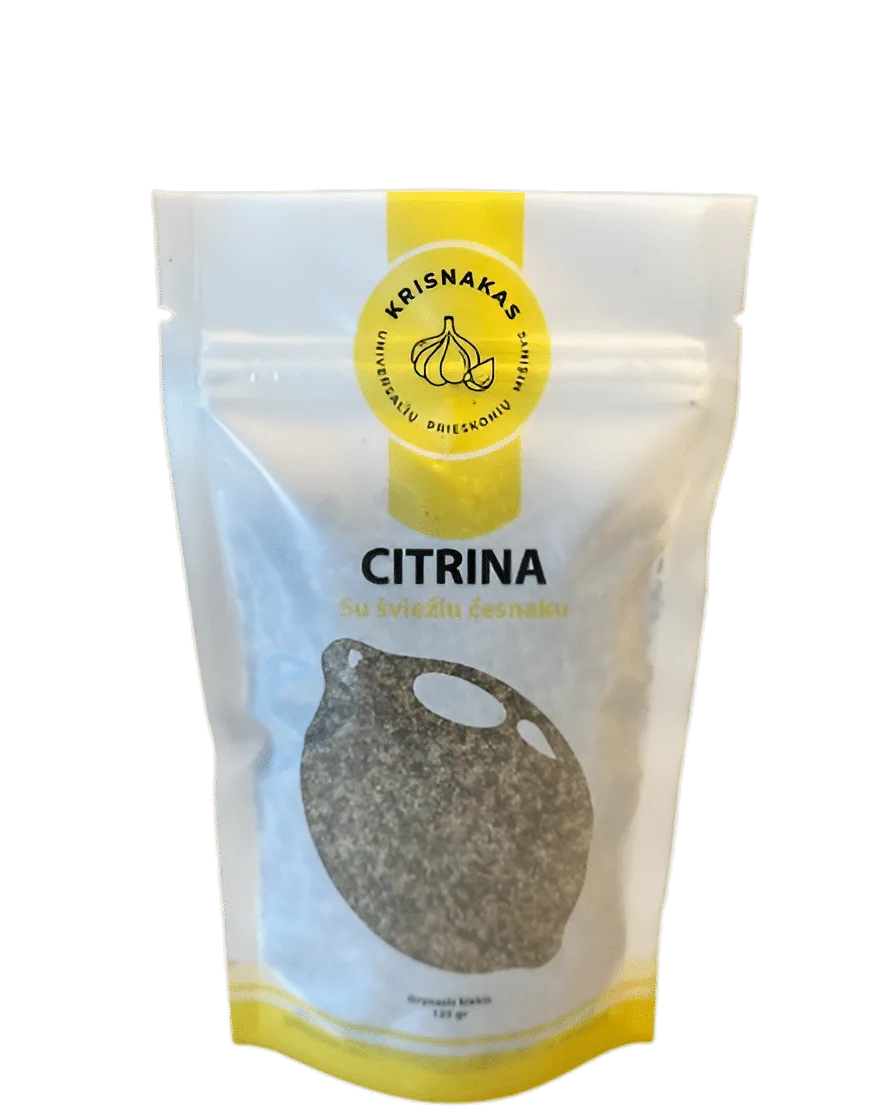 Sudedamosios dalys: česnakai, jūros druska, citrinos žievelės, bazilikas, čiobrelis.