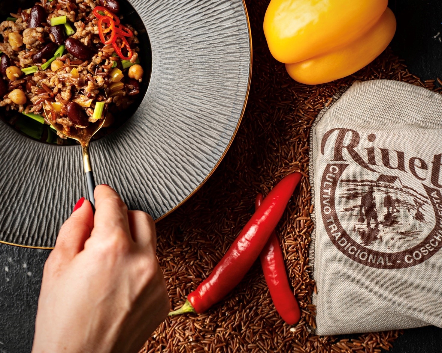 Raudonuosius ryžius pamerkite į vandenį per naktį, tačiau net ir garai išmirkytus juos prieš gaminant ši patiekalą reiks virti apie 30 min lengvai pasūdytame vandenyje. Puode užkaiskite alyvuogių aliejų ir jame pakepkite susmulkintą svogūną, česnaką, čili ir geltonąjį pipirą. Kai svogūnas pagels sudėkite perplautas konservuotas pupeles, avinžirnius ir kukurūzus bei šiek tiek viską pakepkite. Keptuvėje pakepkite maltą mėsą ją susmulkindami, kad sutrupėtų į smulkius gabalėlius, pagardinkite druska, pipirais ir kitais mėgstamais prieskoniais. Viską sudėkite į vieną puodą ir gerai išmaišykite. Lėkštėje papuoškite smulkintais žalumynais. Štai ir viskas. Ar bandysite?