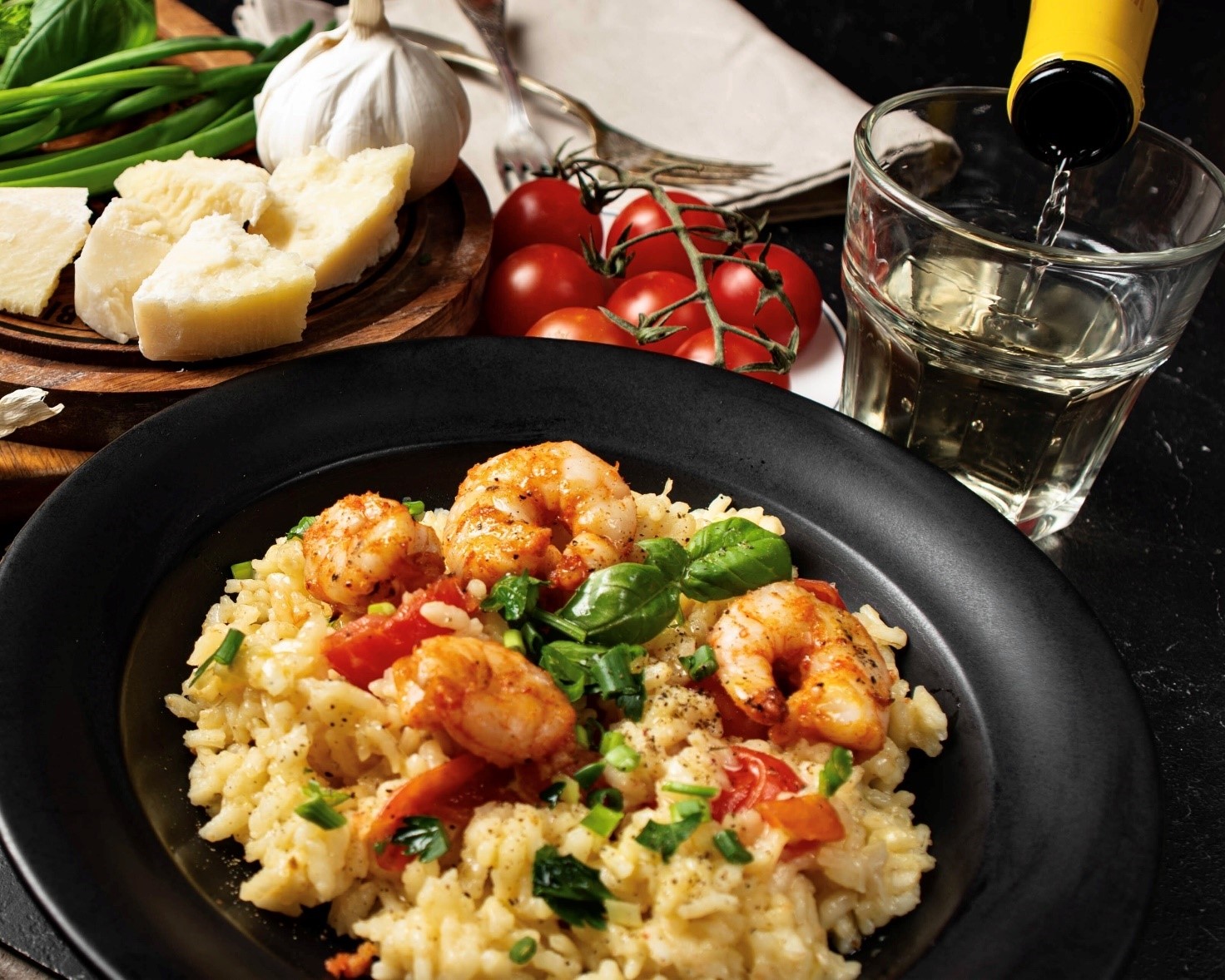 Į lėkštę dedame rizoto, ant viršaus keptas krevetes, pomidorus, papuošiame žalumynais ir mėgaujamės. Beje prie rizoto puikiai tinka Pinot Grigio, ar Sauvignon Blanc baltojo sauso vyno taurė.