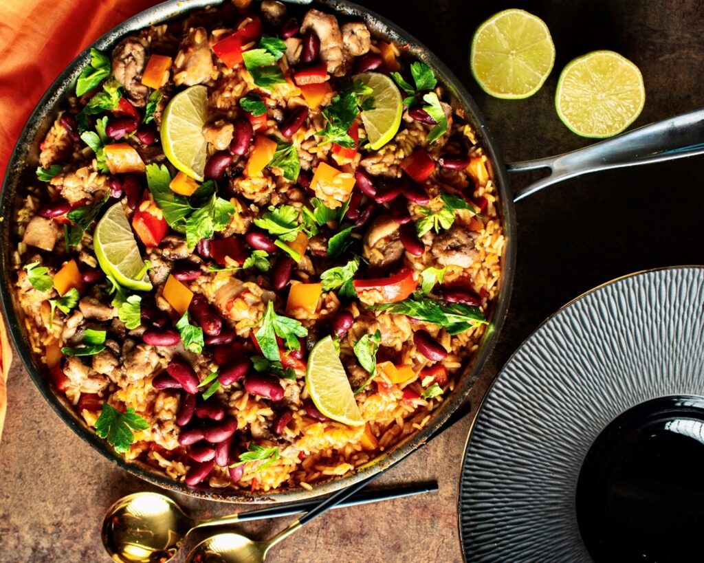 Vištieną supjaustome nedideliais kubeliais ir užmarinuojame su medumi, balzaminiu actu, extra virgin, druska, pipirais ir palaikome apie pusvalandį. Tuomet ją pakepame kol apskrus ir atidedame. Į tą pačią keptuvę dedu pjaustytus svogūnus, česnakus, paprikas vidutinėje kaitroje kepame kol daržovės suminkštės. Šiek tiek šafrano užpilame šiltu vandeniu ir paliekame. Į tą pačią keptuvę supilame gerai nuplautus ryžius, skardinę smulkintų pomidorų ir apie pusę sultinio ir šafraną. Viską išmaišome ir nedidelėje kaitroje leidžiame ryžiams sugerti skystį ir išvirti. Verdant reikia stebėti ir prireikus papildomai įpilti sultinio. Taip virti kol ryžiai taps minkšti. Pabaigoje sudedame pupeles, viską išmaišome, o pupelėms sušilus dedame į dubenį, beriame kapotas petražoles, šalia patiekiame žaliosios citrinos skiltį.