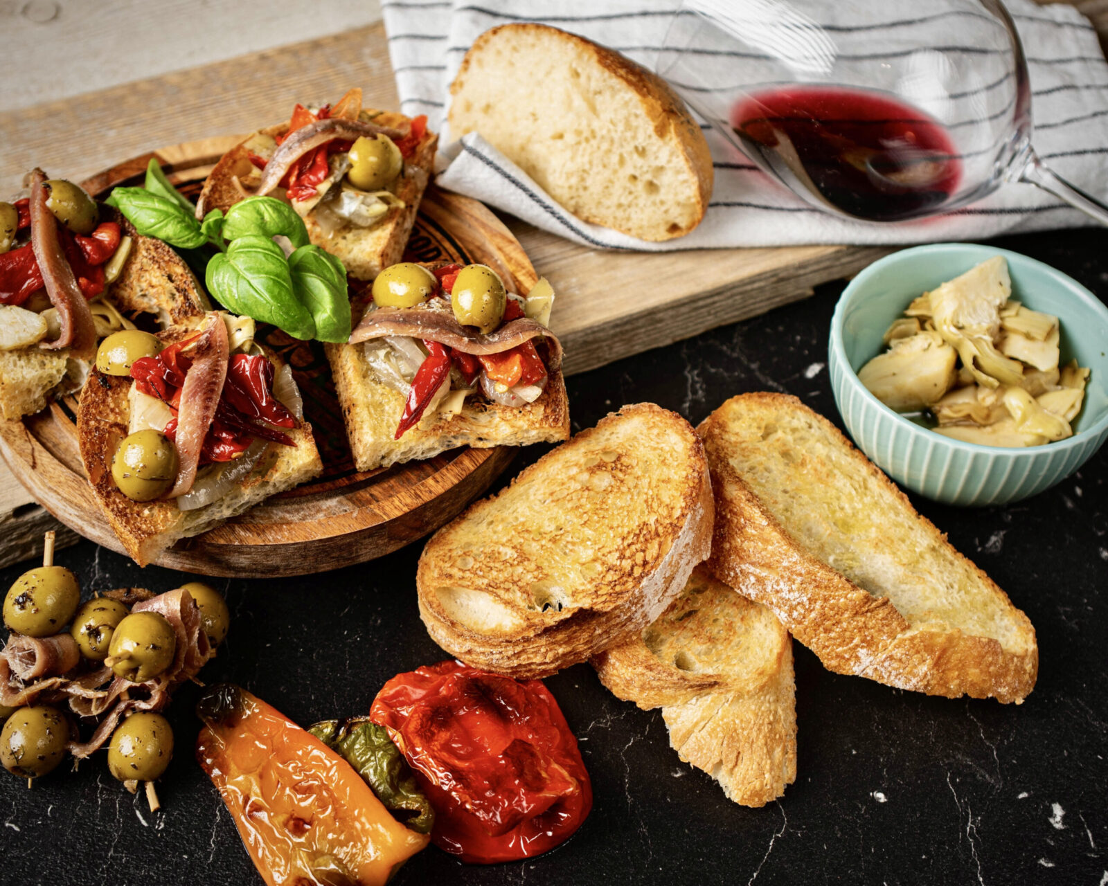 Šviesios ciabatos riekes gausiai pašlakstome alyvuogių aliejumi ir šauname į orkaitę su grilio funkcija kol gražiai apskrus. Kai riekės apskrunda, išimame ir padedame į šalį, jos mums puikiai tiks ir šaltos. Paprikas perpjauname (galime padalinti į keturias dalis), išimame sėklas, pašlakstome alyvuogių aliejumi, pabarstome druska ir dedame į orkaitę (200C) maždaug 15-20 minučių kol suminkštės. Per tą laiką keptuveje pakepame supjaustytą svogūną ir artišokus. Pagardiname druska ir pipirais. Kepant galima užberti šiek tiek rudojo cukraus, kad įgautų gražią rusvą spalvą. Kai visi komponetai paruošti, tiesiog sudedame viską ant paskrudusios duonos ir viskas. Galite papildomai pagardinti alyvuogėmis ir žalumynais.